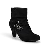 Multiple buckles intertwine atop round toe trendy ankle bootie. Sturdy modest heel adds an elegance flair to this darling.Approx. Heel height: 3 1/4".Approx. Boot shaft height: 5"; Calf circumference: 12".Size Runs: True to size.Style: Pull-on.Main Color: Black.Material: Micro-suede.Style Name: Caden. (SKU: CADEN-BLK-IMSU)